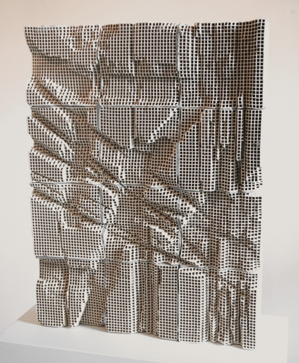 The strongest pieces in the show are made of engineered ceramic blocks that have been cemented together and carved. The most powerful of these are the three works Slab #2, Slab #3, and Slab #4. In each, twelve engineered ceramic blocks have been stacked in four rows of three to form tallish rectangles. These engineered blocks are sections of extruded ceramic grid made for high-heat industrial applications like furnaces and engines. The blocks appear solid on four sides, but are mostly empty and largely transparent when viewed from either of their opposing latticed faces.