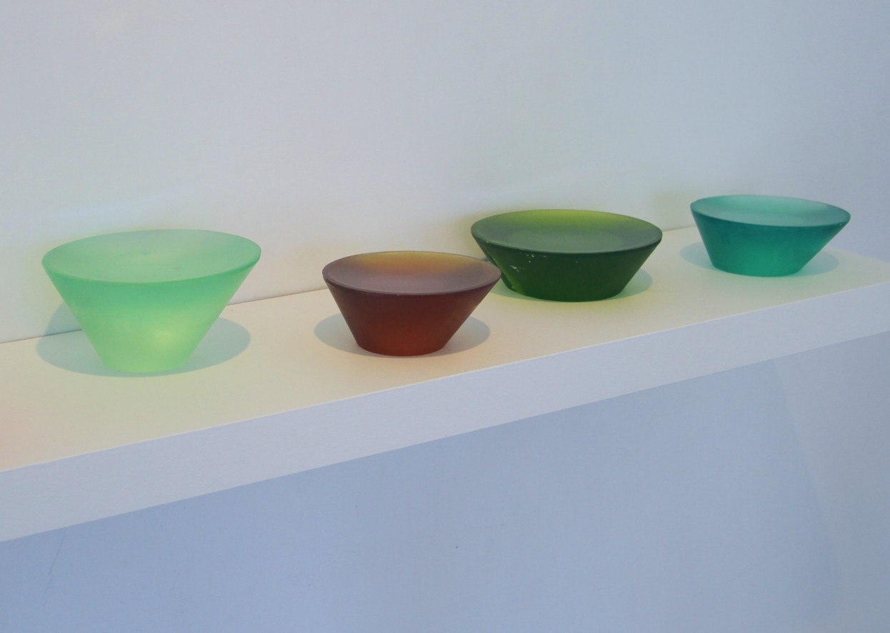 Randy Colosky, l to r: Light Green Pool, Amber Pool, Green Pool, Pink Pool, 2014; installation view, Rise and Fall, 2014; cast lead crystal; l to r: 6.62 diameter x 2 in., 5.75 diameter x 2.5 in., 7 diameter x 2 in., 5 diameter x 2 in. Courtesy of the Artist and Chandra Cerrito Contemporary, Oakland.