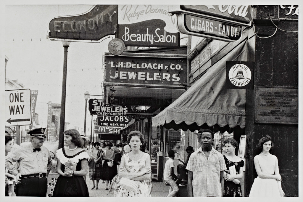 Despite the markers throughout the exhibition of an era sixty years prior—registered in the photographs as long-retired cars, politicians, and Hollywood stars—Frank’s work has an unexpected prescience. Through his unflinching view of 1950s America we see our present, full of disparity and contradiction.