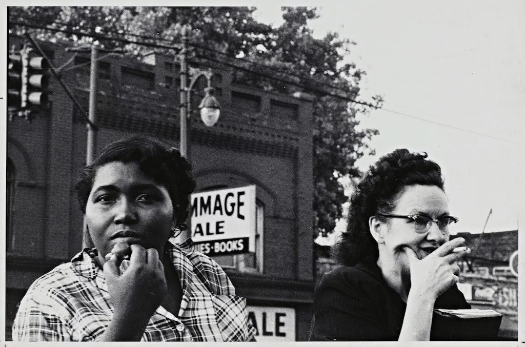 A section near the midpoint of the show particularly resonates: a grouping of photographs taken in the South touching on racial tensions. Frank’s interest in the racial politics of the United States is a theme throughout the show and is exemplified in Main Street–Savannah, Georgia (1955), a street scene of a group of pedestrians waiting to cross an intersection. Here, a white woman with her arms crossed stands next to a solitary black man. Retail signs dominate the top third of the photograph and suggest a commercial world that the black man cannot access. Later, in the section devoted to the South, Frank zooms in on the issue in photographs like Beaufort, South Carolina (1955) and Detroit (1955). Beaufort, South Carolina depicts a black family proudly posed around their car, the mother and father figures perched on the hood, defiantly regarding the photographer. Detroit is characteristic of Frank’s striking portraits: a close-up shot of a black woman staring into the camera as she is about to eat something in her hand, the shape of her grasp echoed in the white woman adjacent, who holds a cigarette to her lips, her thumb pressing into her cheek. Although physically close, the two women do not appear to engage with each other. Through revealing details, Frank charts the uneasy political geography of a vast country on the verge of change.