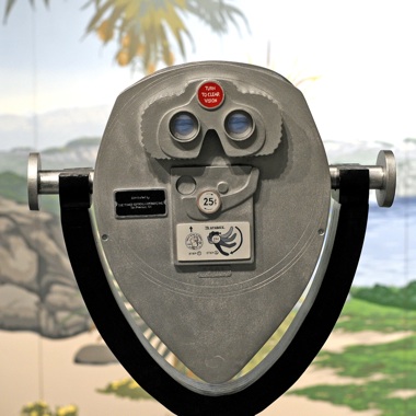 Elisheva Biernoff. They Were Here, 2009; painting: acrylic latex on plywood; 8 x 16 ft; binoculare: acrylic latex on MDF and plywood; 67 x 24 x 24 in. Courtesy of ProArts, Oakland.