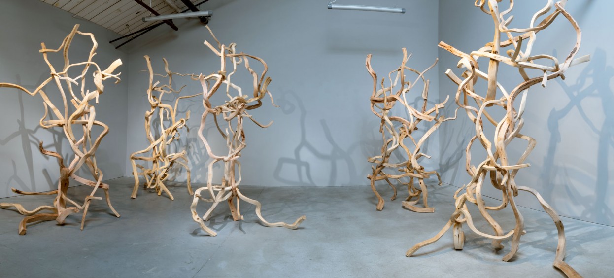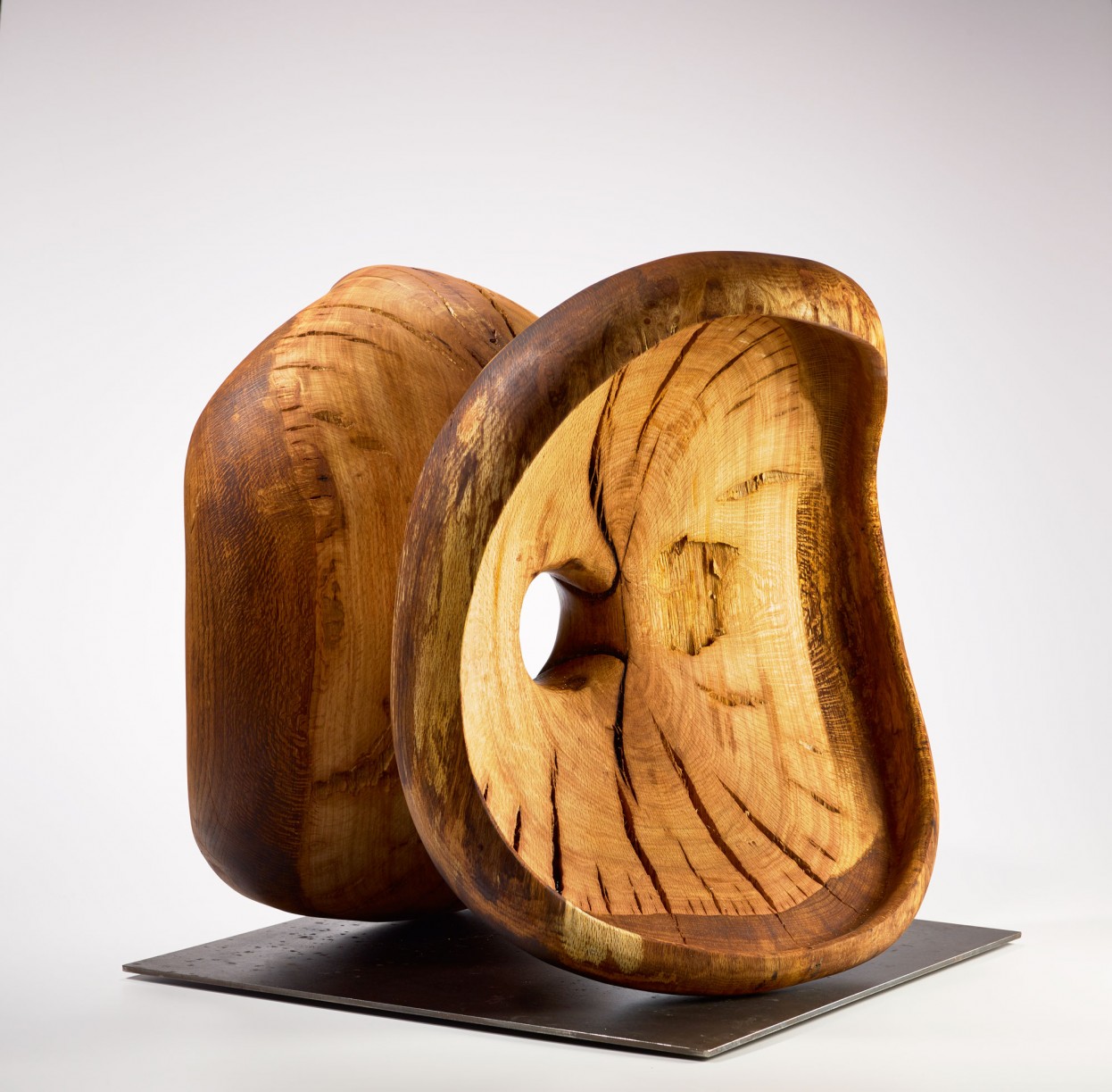 Still, we’re only at the exhibition’s entrance. Inside there’s a crowd, but not of people. Of tango dancers. Wood figures that say, “Watch where you’re going, we’re in the middle of class.” The space is a bramble of unvarnished oak and yet each element seems as soft as fettuccini. Such food analogies are not something Perry shies away from. He clearly likes to play, calling one piece D.Q. (2018), as in Dairy Queen. But again, it’s more like two soft-serve ice cream cones engaged in a Scottish reel. Butterfly Supernova (2019), a yo-yo-like piece with seeming nods to Anish Kapoor and Lee Bontecou, is a title that begins to capture the movement in this show. For what happens here with this work is indeed about movement, but there is also a stillness; a quietude that makes you glad you’re speechless—stumped by that word on the tip of your tongue—because it would be a shame to short circuit the seeing, the awe at material, at form, hewn.