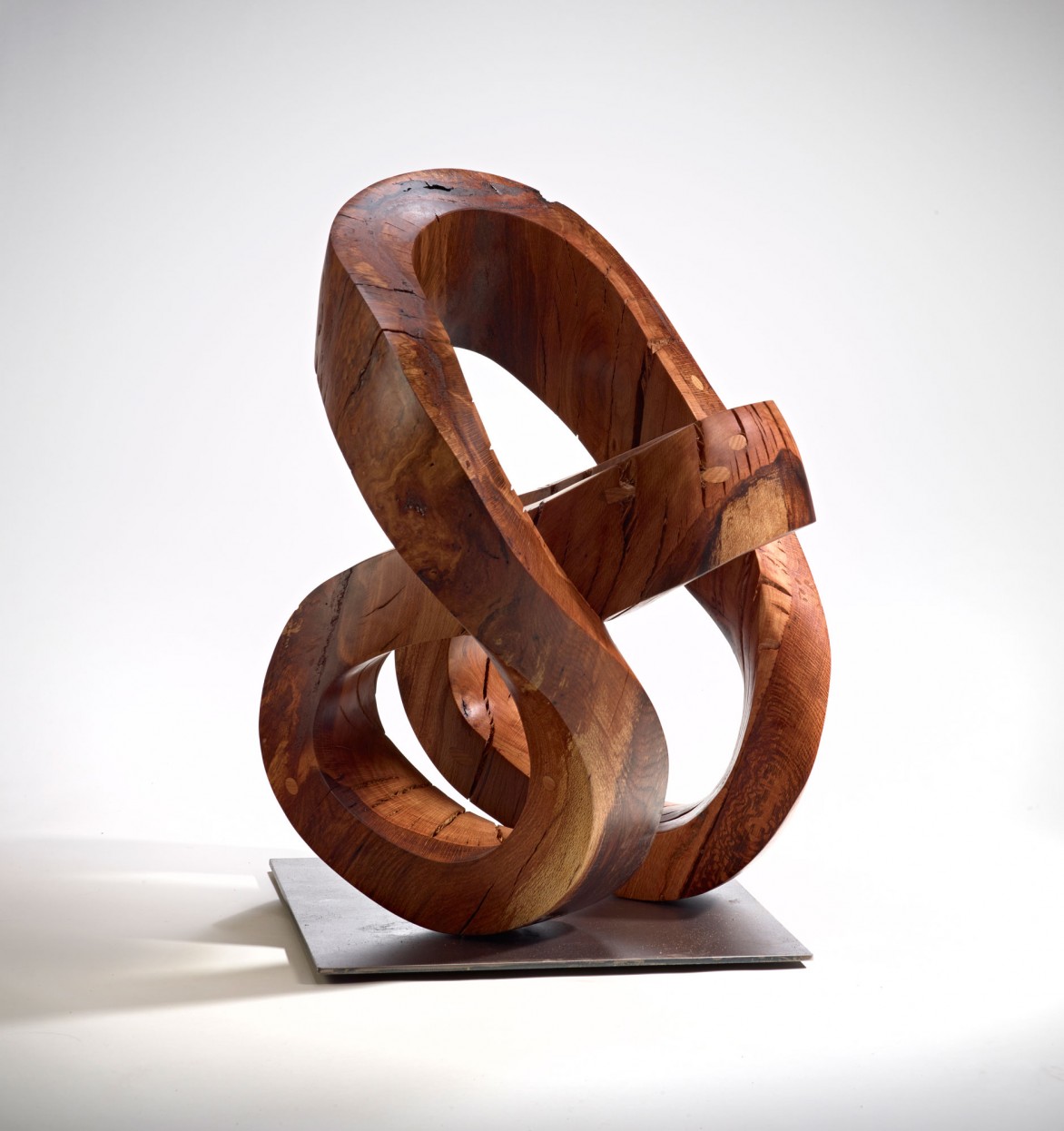 Mobius, as in Mobius strip, was the word I was searching for to describe the sculpture’s ribbonlike simplicity. But right away it seemed inadequate, oversimplifying. Perry’s forms, each of which come from a single stump or log sourced from Runnymede Sculpture Farm in Woodside, California, defy even the most elegant geometry, and therefore they defy fixed terms. But since we’ve conjured a Mobius strip, for better or worse, think of two of them doing the tango.