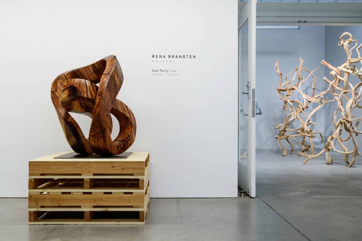 November 21, 2019Upon seeing the twisted and fissured wooden sculpture stationed outside Sam Perry: Clew at Rena Bransten Gallery, there’s a word on the tip of my tongue, but I can’t quite find it. It refuses me, and for an hour it haunts me. And yet, I have the feeling that when it comes—as often happens when you finally retrieve the word you have been pining for—soon will follow the creeping sense that the word doesn’t live up to all the hype. In this instance, it was fitting that the word wouldn’t come, for as Paul Valéry wrote, “Seeing is forgetting the name of the thing one sees.”1