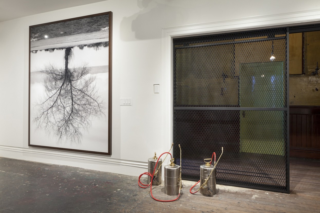 By contrast, Anicka Yi's installation, Immigrant Caucus (2017), invites an unsettling first encounter. Its components—a half-open, powder-coated mesh gate, and three stainless-steel canisters outfitted with red tubing and insecticide-spraying nozzles—are immediately strange. Yi's installation separates the room at the entrance from the house's main hallway, an intervention that delimits physical movement while evoking more troubling associations with detention and border politics. It is a visually arresting tableau that initially distracts from the faint scent emitting from the canisters, which is vaguely floral and slightly acidic.