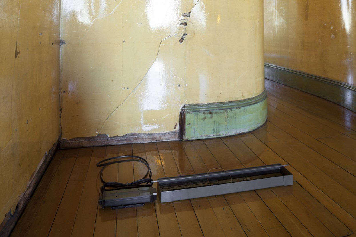 K.r.m. Mooney. Circadian Interface III, 2017; pneumatic actuator, steel tray, grounding wire, inset glass, silver, steel, organic compounds, water; 42 x 22 x 6 in.; installation view, School of Chairs, 2017. Artwork courtesy of the Artist and Altman Siegel, San Francisco. Installation image courtesy of The 500 Capp Street Foundation. Photo: Henrik Kam.
