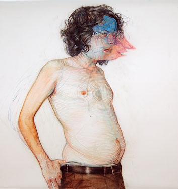 January 25, 2011Geoffrey Chadsey’s solo show at Electric Works proves that the artist, who trained in drawing and photography at California College of the Arts, is increasingly “thinking like a painter.” Chadsey excels as both a colorist and portraitist; his art unites multiple visual languages together with notions of desire, homosexuality, gender, and technology in this new suite of watercolor-pencil-on-Mylar drawings.