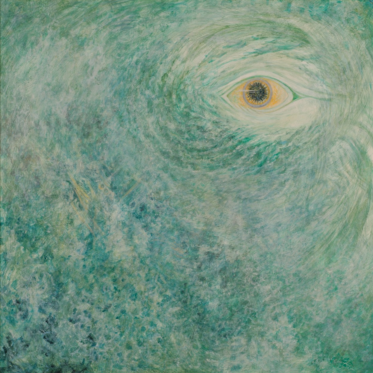 A striking instance of this reappearance occurs in the more recent work Eye Sees the End of the World (2010), which is largely an abstract color-field work, with dynamic layers of green, blue, and yellow pigments, and a stylized yellow eye in the upper-right quadrant. The image brings to mind satellite images of the ocean, diagrams of hurricanes, fantasy novels, and pictures of deep space. Several of Fein’s later works, such as Twin Eyes in the Sky (2010) and Green Eyed Star (2010), embody this oscillating tension between representation and materialist abstraction, similar to the works of Bay Area painter Kim Anno.
