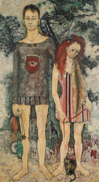 Sylvia Fein. The Lady with the White Knight, 1942-43; egg tempera on board; 29 x 16 in. Courtesy of the Artist and Krowswork, Oakland. Photo: Nick Pishvanov.