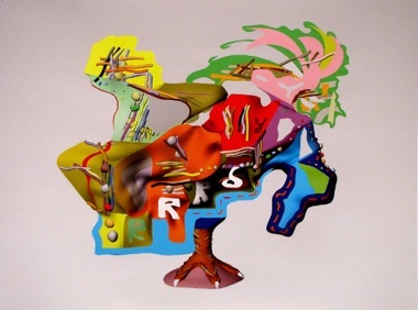 Geshlider created three-dimensional sculptures—variously figurative and abstract, but all colorful, humorous, and somewhat toylike—on a computer program entitled Solidworks. These virtual artworks he realized in two-dimensional archival inkjet prints like Troll (2009) and Birdfoot (2009); and, more impressively, in three-dimensional sculptures created, miraculously, by an industrial-prototype Z-Corporation printer that sprays out alternate layers of plaster powder and water-based colored inks. The resulting sculptures, e.g., Yellow Face (2008), Journal (2008), Train-Fraction (2007), Turtle (2007), were thus untouched by human hands—until Geshlider coated them in protective epoxy or cyanoacrylate resin. Some of his more abstract works suggested a hilariously demented mixture of Frank Stella, Stuart Davis, and Peter Saul.