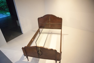 Roy McMakin. The bed I bought when I was a teenager that was later put in the creepy (maybe haunted) room in my parents' basement where I had to sleep until Mike refused, 2011; found object with two mirrors; installation view, Walter and McBean Galleries, the San Francisco Art Institute. Courtesy of the Artist and Anthony Meier Fine Arts, San Francisco.