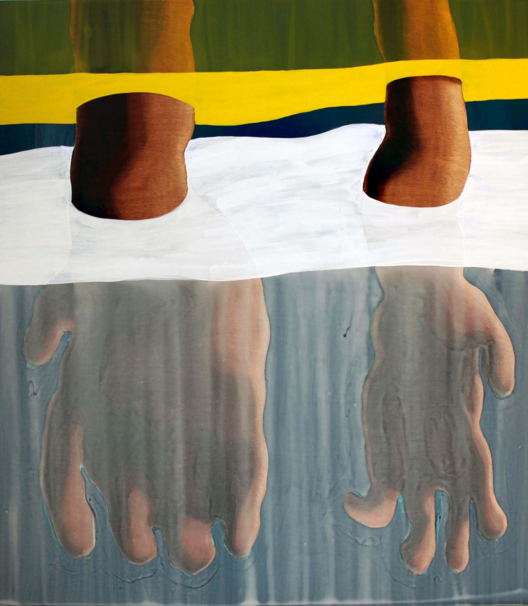Through paint-pouring and mark-making, William explores the fragmentation of figures in his acrylic paintings. In Sanitizing Sanity (2013) two vastly different-size hands are placed into what looks like a body of water. Through a glaze of white on the water’s surface, the hands look reflected and morphed. This distortion makes the painting feel surreal, while the strong hands simultaneously cause it to appear firmly rooted. William achieves an eerie effect through his abstract pouring of paint. The end result is a depth signifying an unyielding emotionalism and darkness that embodies the direction of the exhibition.