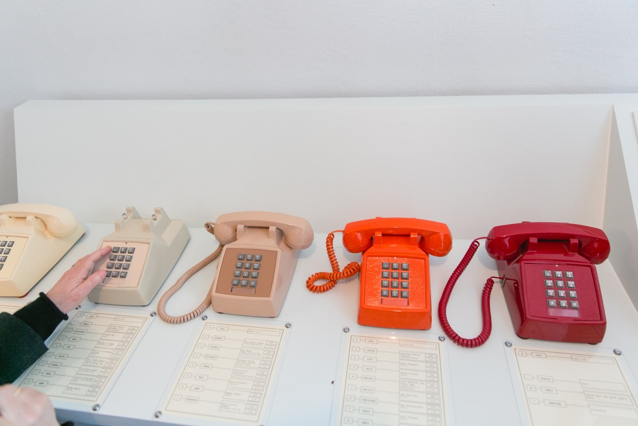 Neither the monitors nor the binder are particularly interesting on their own: the binder is a tedious and exhaustive catalog, and the images of the objects on the monitors, which are the same as the photographs in the binder, are redundant. Opposite the display case and binder is a bank of desk phones: Push a number and hear oral histories, birdcalls, or the sounds of waves crashing on nearby Rodeo Beach. Compiled from artist residents and local historians, these stories provide a richness to the experience of the archive that is largely lost in viewing the display case or binder. The archive comes to life in the context of how an object was used by an artist during their residency, and Hott’s inclusion of stories about the Headlands’ past as a military base and home to the Miwok tribe deepens the conversation.