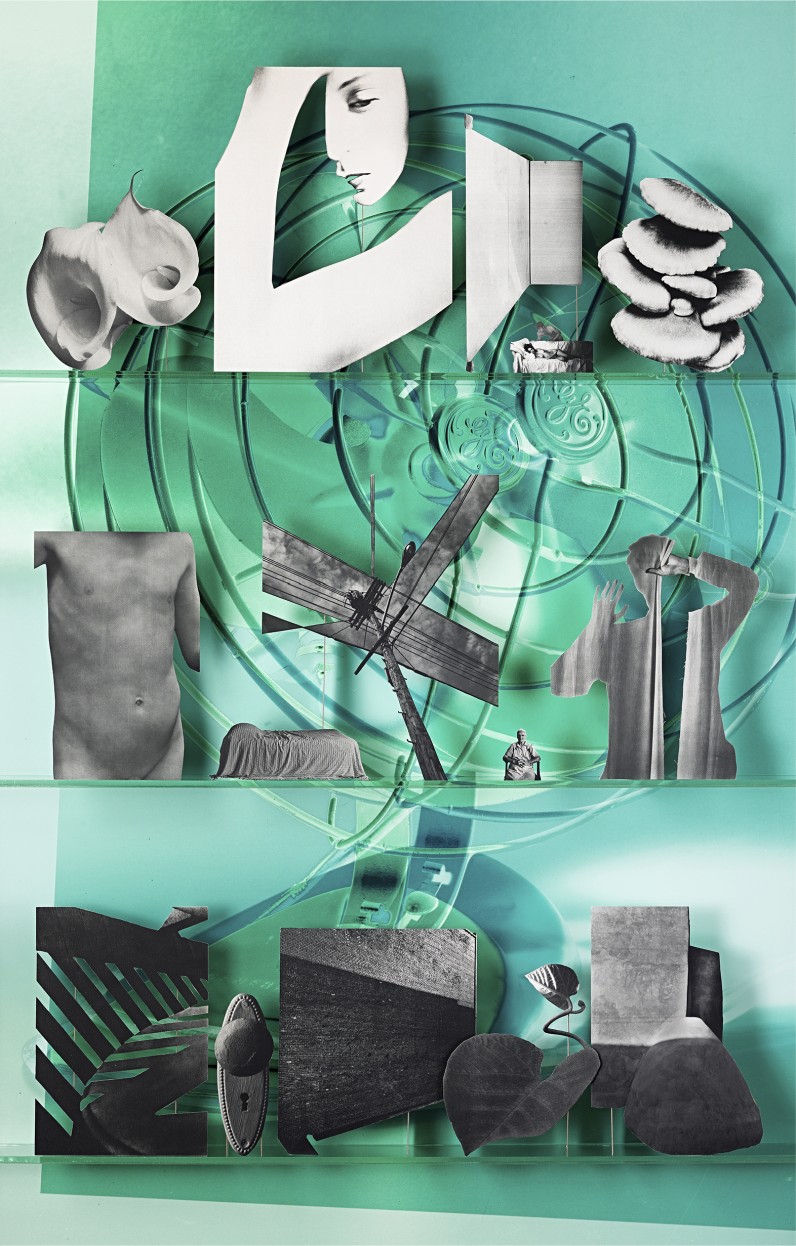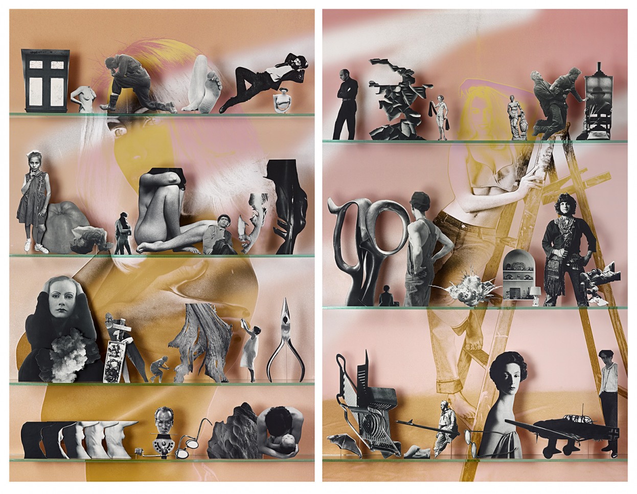 Sometimes, the works defy interpretation. The diptych Themes (2013) features a washed-out yellow-pink backdrop with a woman bare from the waist up, arms folded across her chest on the left panel; on the right, that same woman wears rolled-up jeans and a bra and leans provocatively on a ladder. The conflation of a female body with hardware is echoed throughout the images staged on the shelves: scissors, pliers, and even an airplane appear next to fragmented bodies and forms. The appropriated images, deliberately trimmed to remove some details, are hard to decipher. The internal juxtapositions are so far detached from the images’ original context that any attempt at constructing a narrative or divining meaning is confounded.