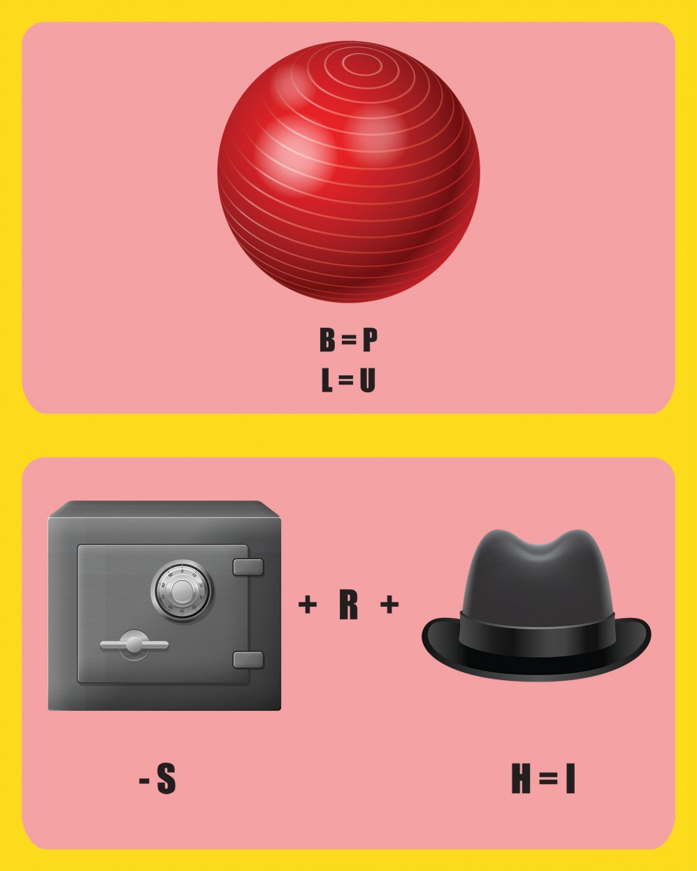 As a viewer, solving these puzzles relies heavily on the associations one draws from their individual elements. Roseborough chose clip-art-like digital illustrations for objects, rendered with a slick, cartoon-like or stock-image finish; it’s up to the viewer to innately reduce the objects to their essence. For example, in Paul Aferiat (2014), one must think “hat,” as opposed to “bowler,” or “homburg,” in order to correctly solve the equation. The same objects often occur across multiple pieces but have a different meaning each time. This repetition reduces emphasis on the thing itself (read: hat, etc.) and shifts the focus to what the overall puzzle represents phonetically.