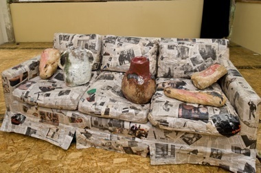 Jessica Jackson Hutchins. Couch For a Long Time, 2009; couch, newspaper, ceramic, 76 x 29 x 35.5 in. Courtesy of Small A Projects, New York, and Derek Eller Gallery, New York. Photo: Dan Kvitka.