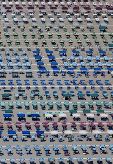 Ruscha’s pattern-breaking, anomaly-seeking logic points to the importance of shifting scales, particularly in images like MacLean’s in which scale is everything. A closer perspective of Umbrella and RV, for instance, reveals that the concrete in Umbrella is actually a beach, a beach littered with sunburnt topless women in white thongs and boys playing with toys. And in RV, amongst the sea of homogeneous RVs all neatly parked at a sixty-degree angle, subtle portraits of play peek through; jet skis and fishing boats, like lost outliers, gain emphasis on a human scale.
