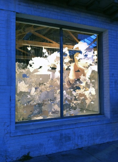 This means that the weather, changing light levels, and even passing car headlights can enter and alter the piece. During the afternoon, the reflection of City Hall, which looms directly across the street, is cast prominently onto the window. Through these constantly changing elements, the city inserts itself into Britton’s installation.