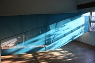 of sunlight on the gallery floor, Clausen has created a three-dimensional translation of these plotted points, which provides a passageway for light to pour into and travel throughout the space. The shadows cast by the sun penetrate the almost fluorescent, transparent blue fabric that stretches over the sculpture’s wooden framework; the added layers of unassuming dimensionality reverberate Foley’s fusion of naturally occurring and man-made geometrical forms. The inevitable wane of sunlight each evening and, consequently, the sculpture’s continuously changing aesthetic, is an integral variable that highlights the ephemeral components at work in Clausen’s installation. Moreover, the sculpture itself invokes a sense of irony in terms of sunlight’s physicality; the title, Flood, and the installation’s blue fabric challenge conventional associations with water, allowing the sun to appropriate an aquatic sense of movement and power, forcing the wooden supports to defy their static nature in order to mimic the curvature of its contents.