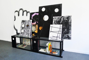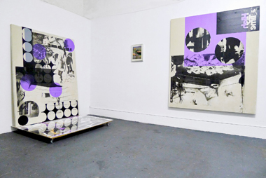 February 21, 2011A low-frequency tone permeates Queens Nails Projects. It’s a dreadful hum: doomy and gloomy, a humid sort of white noise hanging heavy in the atmosphere. Paintings and other objects hang, are propped or stacked, or lean against one another and the white walls. Fist-size holes in these objects allow viewers to see the collages, screen-prints, and hand-markings on canvases partially hidden beneath. In each work and throughout the exhibition, these holes speak to their remnants: positive and negative spaces yearn to be one and the same. Simultaneous presence and absence is the logic that rules in artists Facundo Argañaraz’s and Chris Hood’s exhibition, The Immortal.