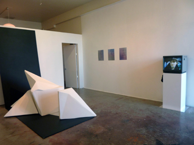 “The Secret Welcome of Space and it’s Prehistoric Future,” installation view, Sight School. Left: Black and McMenimen, 1903- Early Earth astronauts create a film depicting life on the moon (lunar ruins), 2010; mixed media. On wall: Black and McMenimen, 1983- A 12" diametric object is hypothesized to be proof of a Mars/Earth parallel (3 prints), 2010; mixed media. Right: Black and McMenimen, 1991- Advancements in extra-terrestrial code-reading reveal secret communications through popular culture mediums and exposes one of those among us (90210 video), 2010; mixed media. Courtesy of Sight School, Oakland.