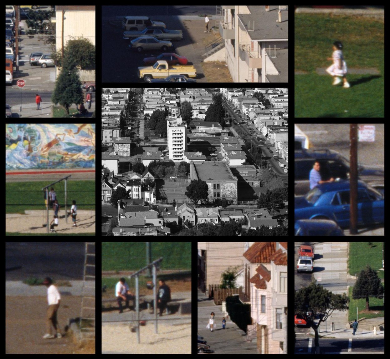 Doug Hall's composition of ten photographs, Neighborhood Watch (1995), subtly continues the theme of race and the transition from childhood to adulthood. A large and sharply focused bird's-eye black-and-white photo of Leonard Flynn Elementary School and the Bernal Dwelling housing project contextualize the work. Hall surrounds this image with grainy surveillance-like color images of children and adults in the school's playground and the housing project's parking lot. As local residents move between public education and housing on a daily basis and as they advance through the institutions with age, they are subject to the surveillance of neighborhood watches, particularly in low-income African American and Latino neighborhoods. In 2016, as San Francisco experiences rapid gentrification, "neighborhood watch" takes on new meaning as many residents keep tabs on their neighborhoods, aware of their own precarious housing situation.