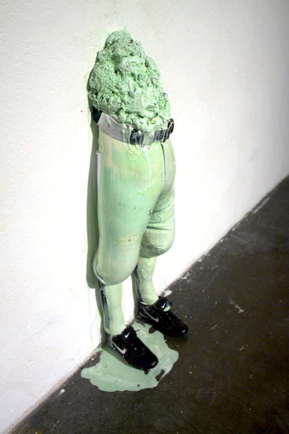 November 15, 2010Enter a gallery when Jen Susman’s Practice Makes Perfect has recently been installed (as it was in Silverman Gallery in July 2010) and anticipate the overwhelming odor of synthetic sweetness. Arrive a few days later, and the olfactory sensation has transformed into the equally overpowering aroma of rotting cream. The smells emanate from ice-cream-filled clothing pinned to the wall. Typical baseball pants, generic athletic socks, and, occasionally, black cleats are attached to the wall and stuffed with gallons upon gallons of ice cream. As time elapses, the ice cream melts at a rapid rate. After approximately three hours, the torso has deflated, and the viscous, pastel substance has crept across the floor in unpredictable directions. Performative by default, the sculpture continues to evolve for forty-eight hours, a slow drip marking the passing of time. Eventually, the clothing molds to the point of decay and it is removed from the wall, leaving only the colored trace of the rotting cream as an imprint on the white surface.