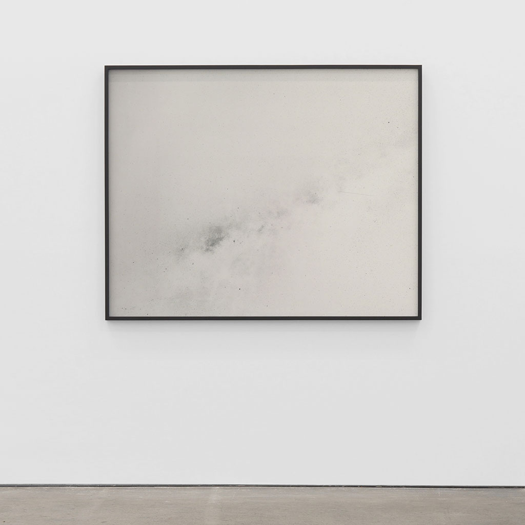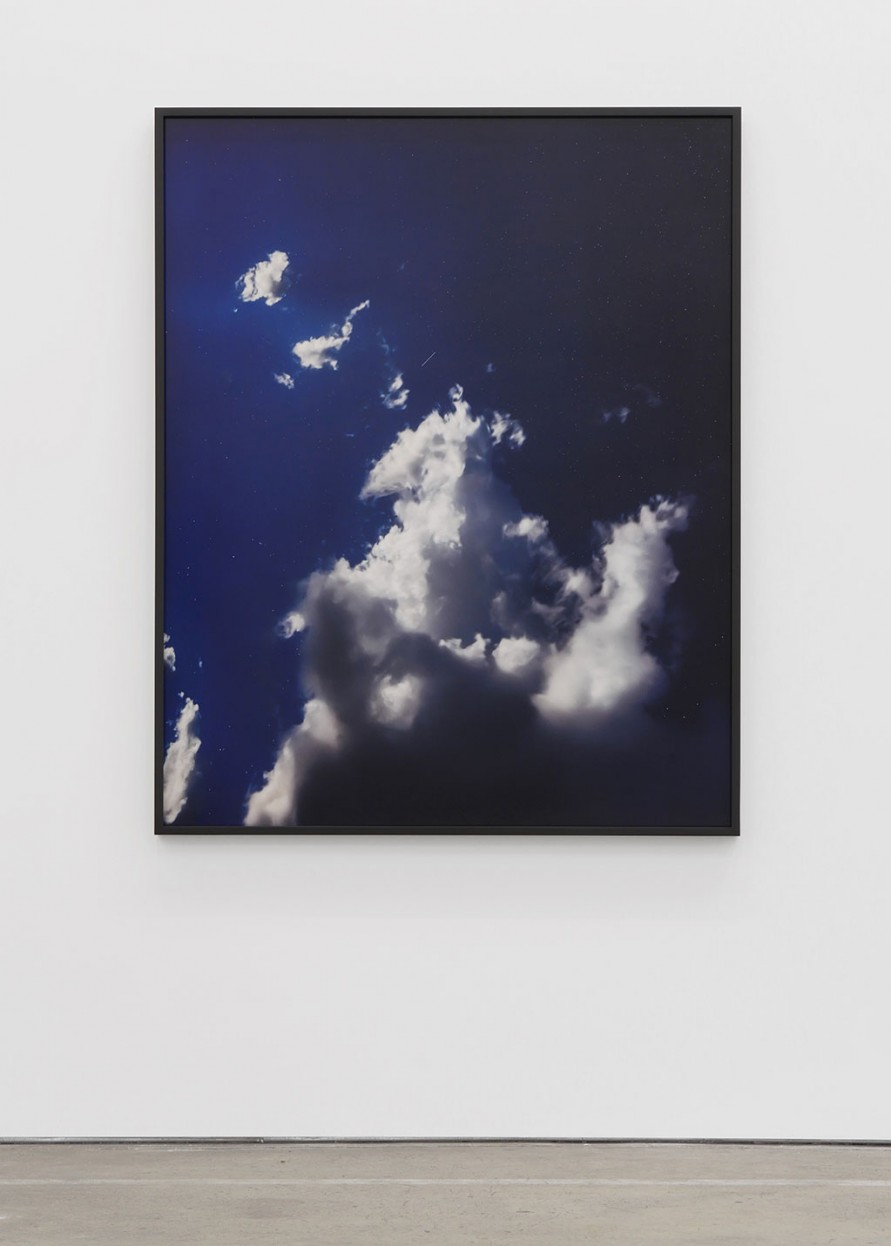 Most of the large photographs belonging to the ongoing series The Other Night Sky (2010—ongoing) are long-exposure nocturnal depictions in which light-dark values have been reversed; the sky’s black is rendered pale, while points of the firmament appear like grainy specks within the frame. This inversion effect turns space into a page. The paths the satellites traveled during the film’s exposure become visible in the form of dark, ruler-straight line segments, mostly oriented perpendicular to the sweep of the stars.