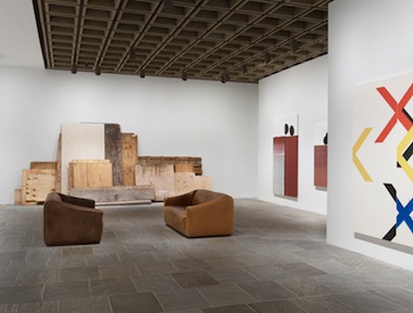 With the defining look of Guyton's paintings perhaps headed for obsolescence, it is reasonable to suspect that another creative impasse may be on the horizon for the artist. It is entirely appropriate, then, that Wade Guyton OS situates the viewer at Woodpile—a fulcrum from which one may look both backward and forward. Indeed, there are two couches, facing one another, placed beside Woodpile—a charmingly unorthodox accommodation and a clear, purposeful invitation for a viewer to sit and take inventory of Guyton's trajectories. Too often, museum exhibitions leave these moments out.