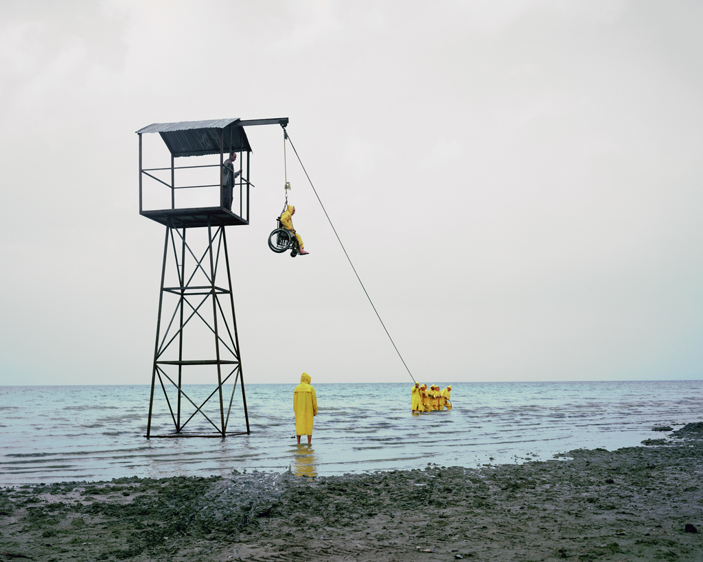 Hirsch’s gorgeously composed videos, 50 Blue (2009) and Wheel Pushers (2010), are similarly open-ended and generous. Featuring allegorical narratives of pastoral cooperation between members of the artist’s own commune, they omit definitive goals and outcomes in favor of interesting work processes and careful study of human labor. The costumes that serve to unite his groups of workers both mimic the utilitarian garments associated with kibbutz life and help to create a singular character for a group of individuals. The accompanying still photos recall pastoral master works by painters Pissarro or Rivera. Viewers are left to draw their own conclusions regarding the purpose and values of the activities Hirsch presents.
