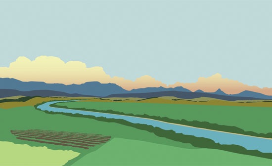 Biernoff’s The Tools Are In Your Hands (2013) is an enormous landscape mural painted over metal that allows viewers to apply cut-out magnets depicting plants, animals, and simple geometric forms, which can be found sorted into nearby bins. Her flat, graphical paint application in blues, greens, and neutral tones suggest calm skies, and fertile land, inviting viewers to finish an image of a valley of well-tended farms in harmony with nature.