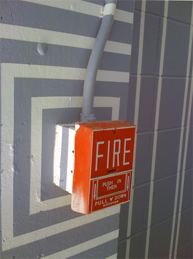 Scholz used painters’ tape to trace the utilitarian protrusions on the hallway’s brick walls and ceiling: fire extinguisher, elevator button, exit sign, florescent light fixture. Halfway through the exhibition, the walls were painted and the tape removed, inverting the colors: bright blue tape became white space, white walls grayish-blue paint. When the show closes the markings will be painted over.